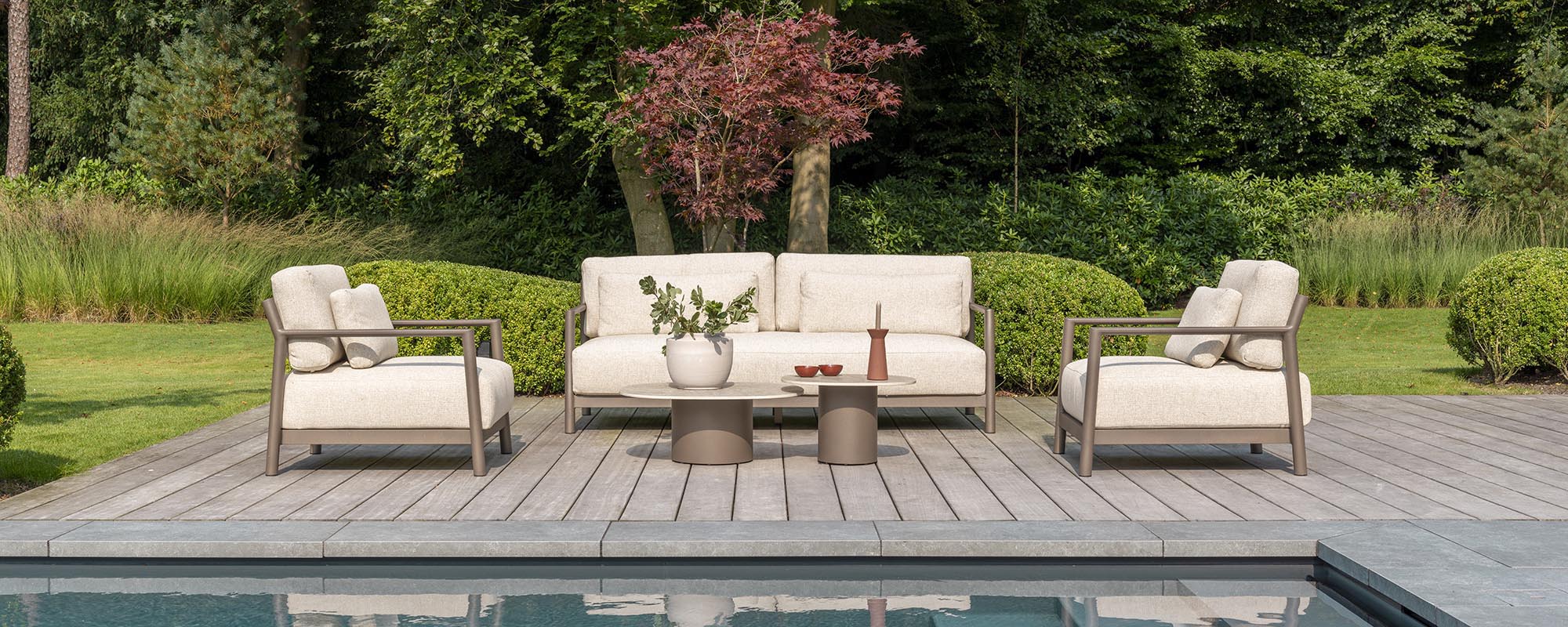 Genießen Sie Ihren Aufenthalt im Freien mit dem Capresi Living Chair, ausgestattet mit drei luxuriösen Kissen, oder wählen Sie die großzügige Capresi 3-Sitzer-Bank mit fünf bequemen Kissen – beide laden zu unvergesslichen Momenten der Entspannung und des geselligen Beisammenseins ein.