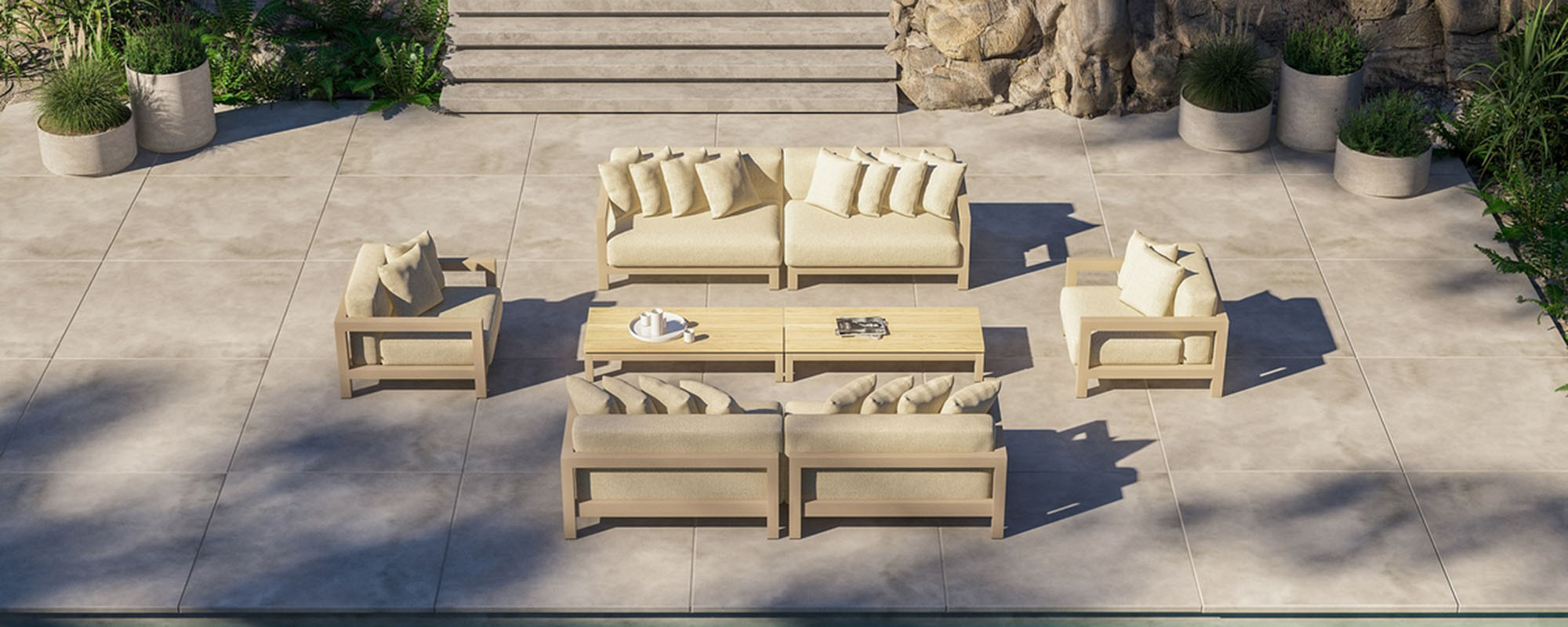 So raffiniert wie es geht. Der kubistische Rahmen des Raffinato in der prachtvollen, neuen Farbe „Latte“ passt zu diesen einladenden Kissen. Wählen Sie zwischen 4-Sitzer Living-Sofa oder Living-Sessel, oder noch besser… Nehmen Sie beide und lassen Sie Raffinato die Show auf Ihrer Terrasse stehlen.