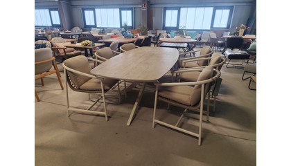 Angebot 28 * nochmals reduziert *SET-Angebot* SET bestehend aus 1x Tisch, HPL Platte oval ca. 240cm, Gestell Alu pulverbeschichtet; 6x Dining Sessel, Gestell Edelstahl pulverbeschichtet, wetterfestes Rope, inkl. Kissen, Bezug abzieh- & waschbar; SET satt €4.672,– JETZT € 3.700,- JETZT SET € 3.500,- JETZT SET € 2.999,- Abholpreis